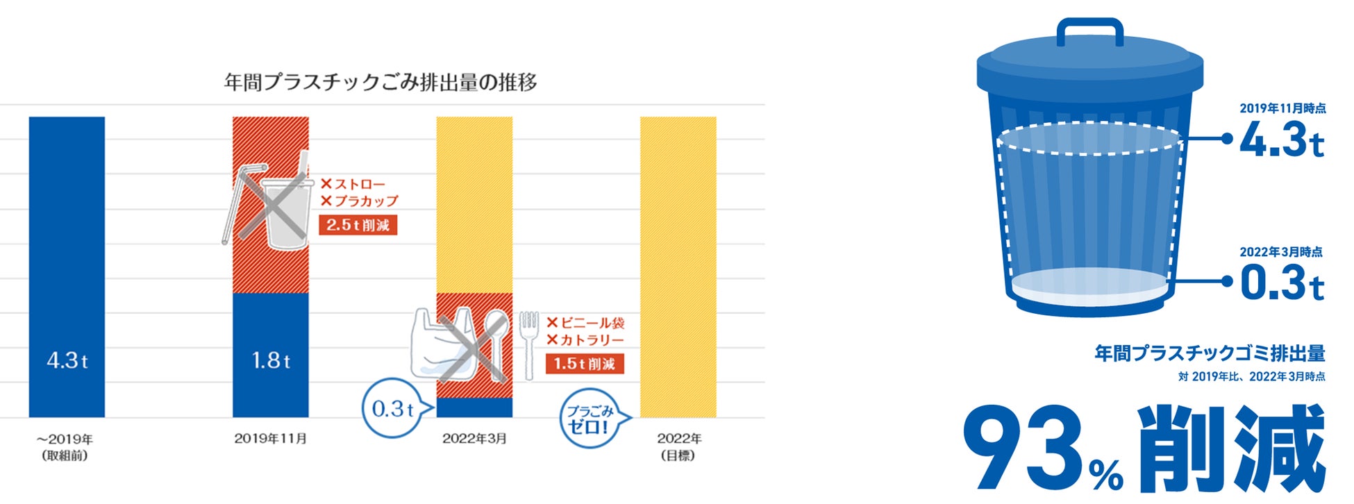 取り組みを開始してから、プラスチックごみの排出量は取り組み開始前と比較しおよそ93%の削減を達成。2022年中にゼロを目指しています。