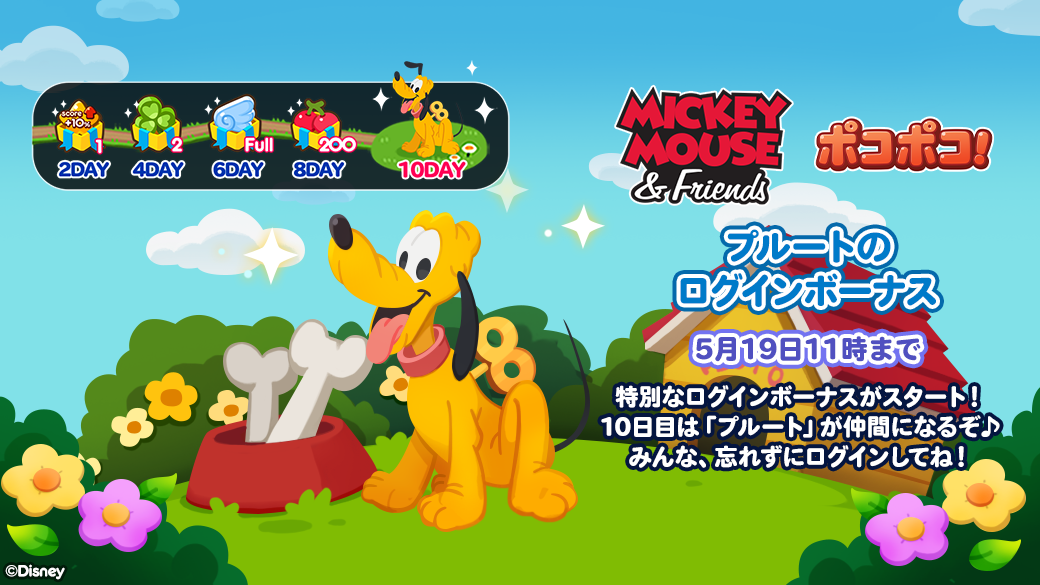 期間中、「LINE ポコポコ」にログインするだけで、クローバーやチェリーなどゲーム内アイテムをログイン報酬としてプレゼントいたします。さらに10日間ログインすると、本イベントでしか見ることが出来ない限定仲間の「プルート」を仲間にできます。報酬は1日1回ずつ入手可能です。