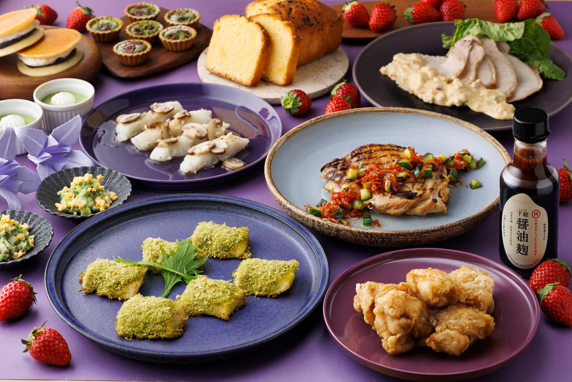 “恋する豚”のステーキ(ランチ限定)/香取のあらたまを使ったブロッコリーのミモザスタイル/香取のさつまいもが入ったラタトゥイユ/サーモンのオーブン焼き ブラウンマッシュルームのアヒージョ/鶏の竜田揚げ 下総醤油麹添え/“恋する豚”のキーマカレー