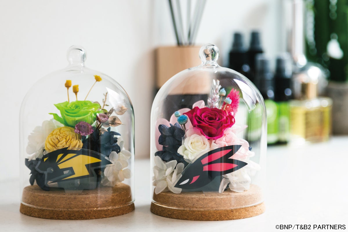 キャラクターカラーのバラを中心に、ヒーロースーツをイメージした配色のプリザーブドフラワーでまとめあげました。