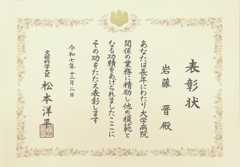 本学からは渡邉技術専門職員と岩藤臨床工学技士が選ばれ、松本洋平文部科学大臣より表彰状および記念品を授与されました。