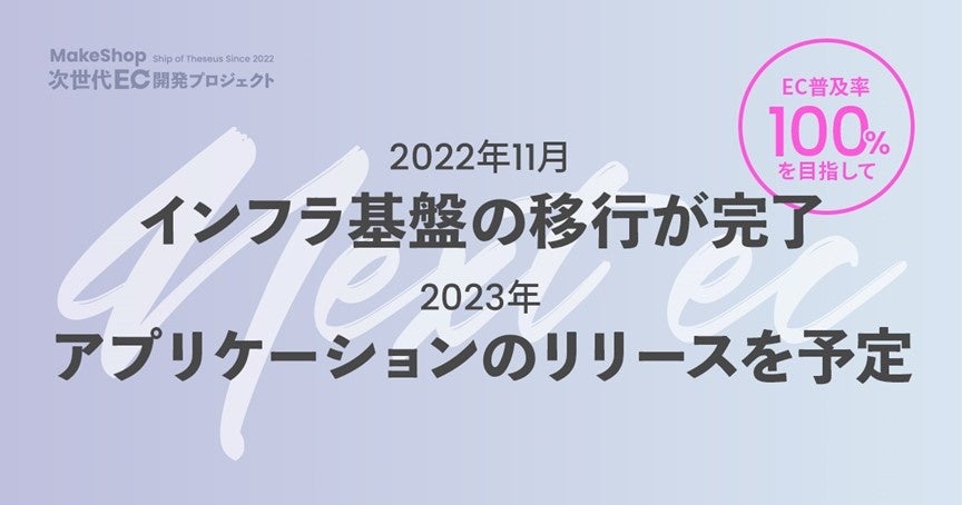 そこでGMOメイクショップは、“誰もがECを利用できる環境=EC普及率100%“を実現させるため、より安心・安全で拡張性のあるシステムの開発へ乗り出しました。EC構築における黎明期から提供し続けてきた「MakeShop byGMO」を、今後の市場環境の変化にも柔軟に対応するプロダクトへと成長させるべく、2020年より『次世代EC開発プロジェクト』を始動しました。これまでに2年以上の研究開発期間をかけて取り組んできましたが、現在すでに進行中のインフラ基盤の移行は2022年11月29日までに完了を予定しており、その後は、アプリケーション周りのリリース段階を迎えます。