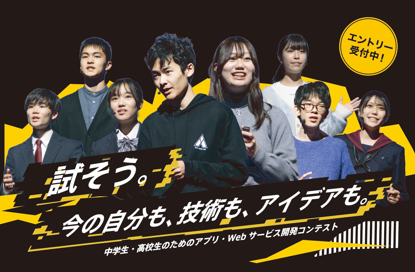 アプリ甲子園は、「試そう。今の自分も技術も、アイデアも。」をテーマに、次世代を担う若手クリエーターの発掘と健全な育成支援を目的として、2011年よりスタートした、「将来世代」である中高生向けのアプリ・サービス開発コンテストです。全国の小中高生が開発した、iPhone®やAndroid™端末に対応するスマートフォン向けアプリや、Webブラウザ上で動作するアプリを広く募集いたします。昨年から新設した、AIをコア機能としたアプリ・サービスで企画力と技術力を競う「AI開発部門」、企画力と技術力を競う「一般開発部門」、協賛企業からの課題を受け、テクノロジーの力を使って解決できるアイデアで競う「アイデア部門」の3部門にて開催いたします。