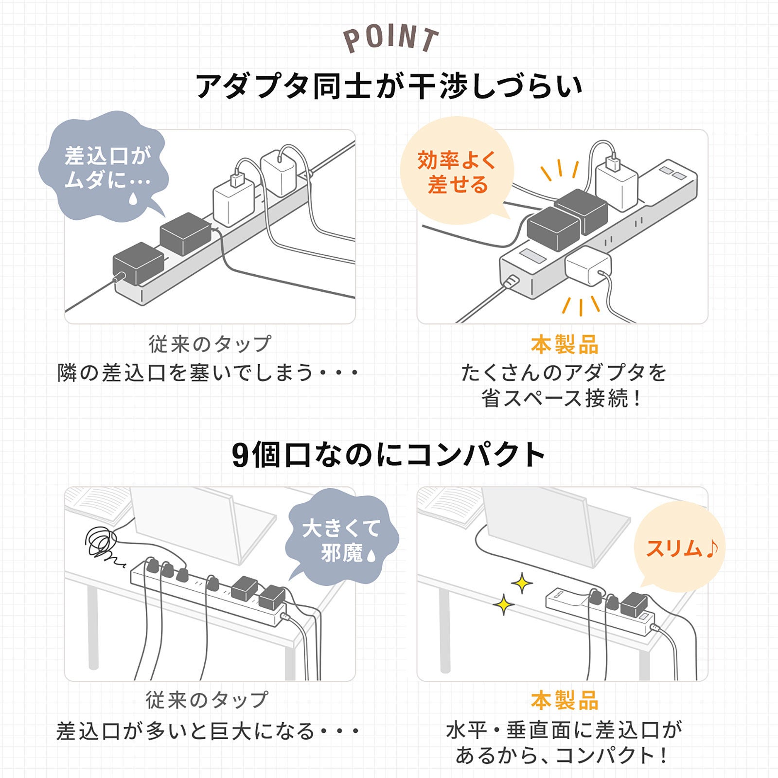 本製品は、左右の側面からも上部からもプラグを差すことが可能な合計9個口の電源タップです。