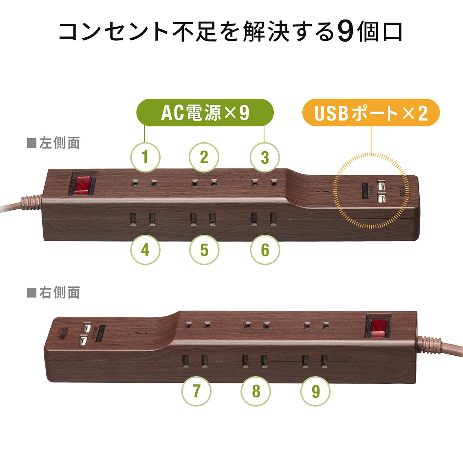 インテリアにも馴染む木目調柄を採用しています。アダプタが差しやすく、9個口でもコンパクトサイズです。
