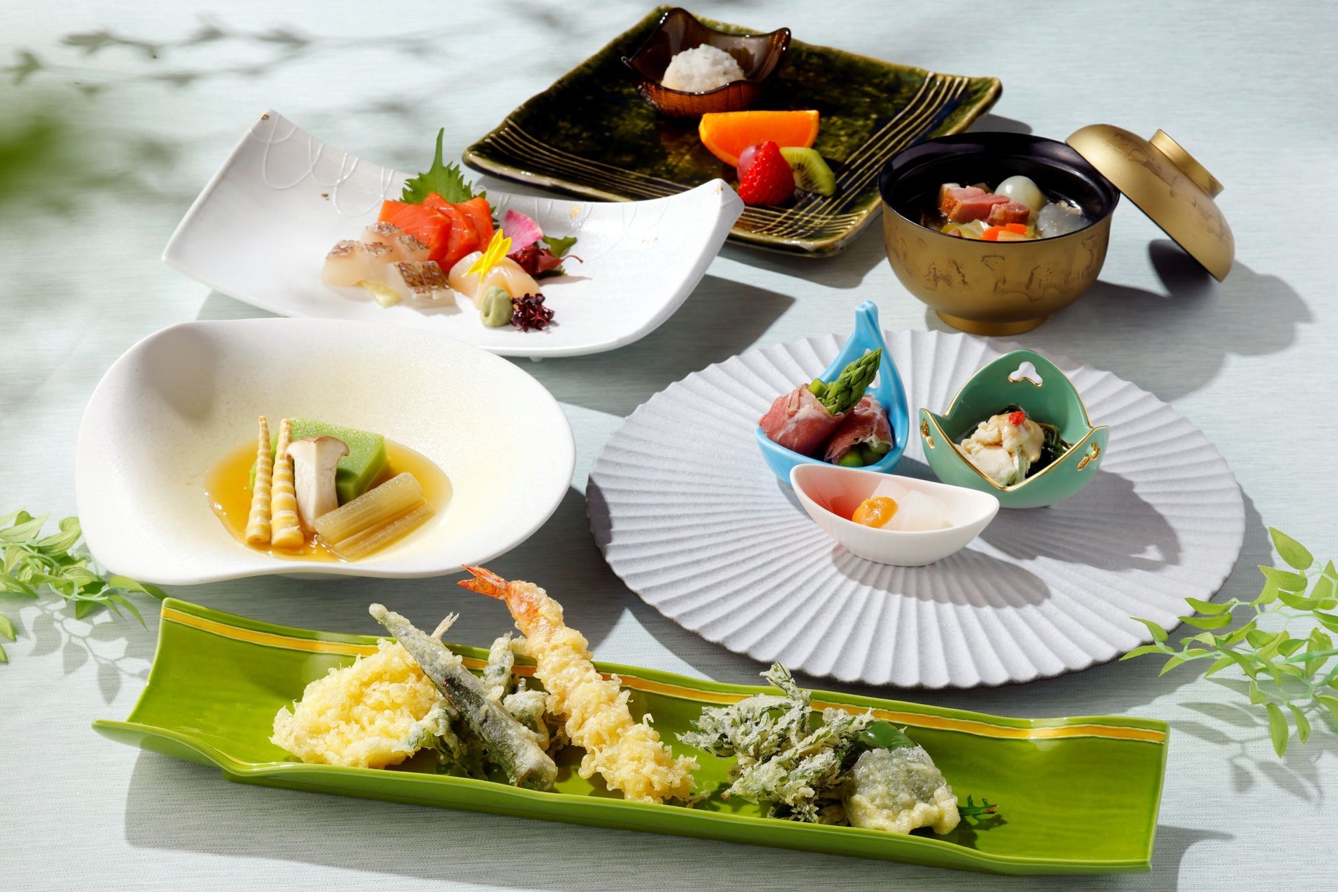 瑞々しいグリーンアスパラやえんどう豆、鱚(キス)など旬を迎える食材を繊細な味わいに仕立てたランチ会席。