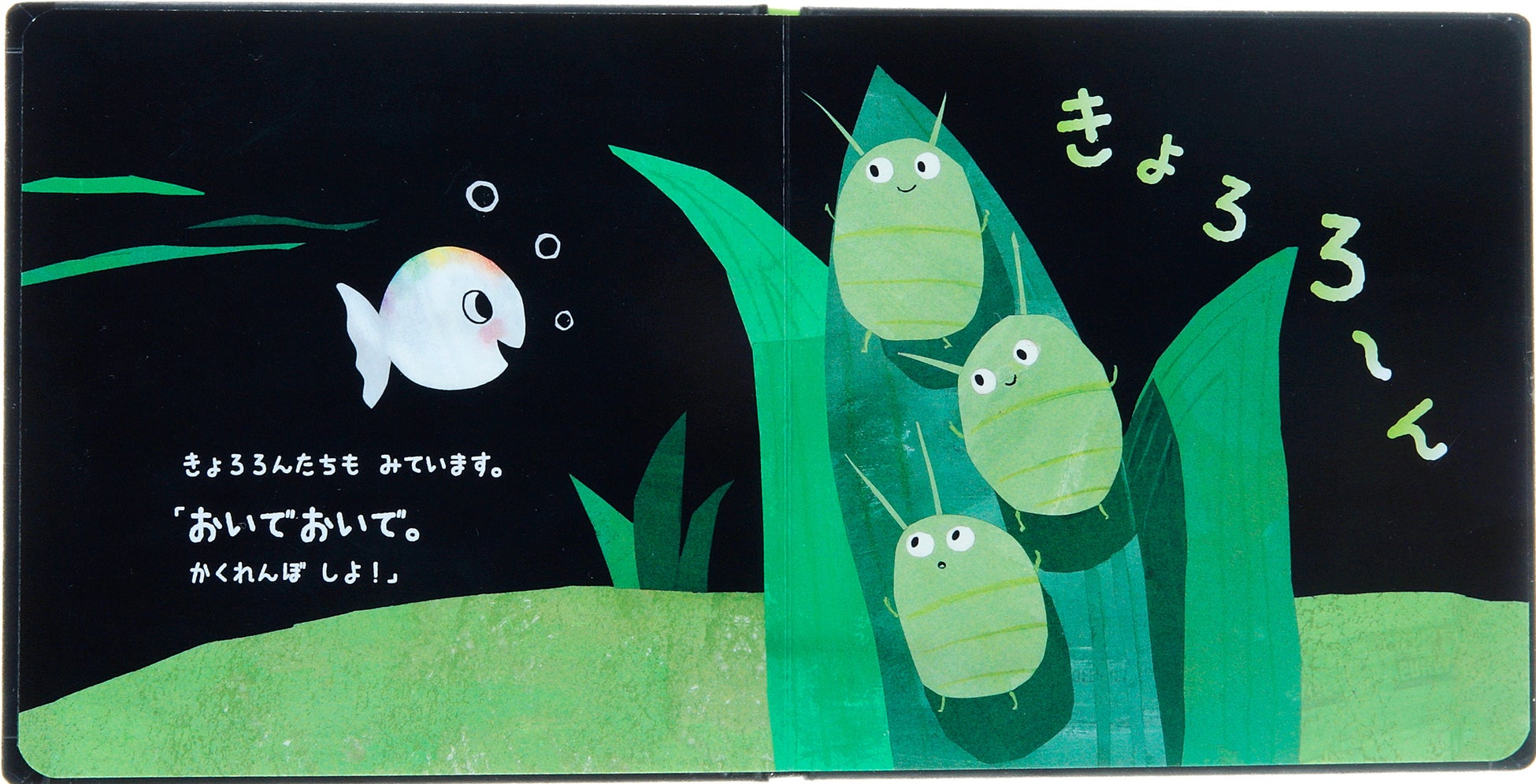 おさかなちゃんのくらす海は、読む人の心の中にある、想像の海。水の色は黒で表されています。最初のページでは、海の底からあがってくるカラフルな泡に、こどもはきゃっきゃっ。指で押さえたり、「あか、あお、きいろ…」といってみたりも楽しい!