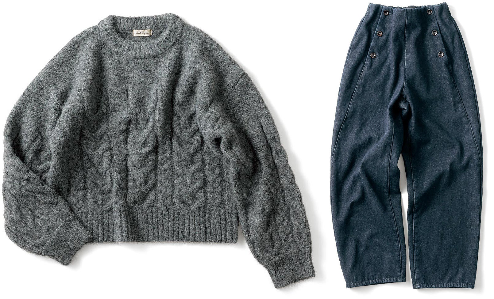 アランニット風の縄編み模様と無地を組み合わせたデザインのセーターです。ふんわりとした厚みがありつつも、軽くて暖かい仕上がりです。裏がフリースのマリンジーンズは、極薄フリースをボンディングしたデニム素材で、すっきりとしたシルエットに仕立てた暖かなパンツです。