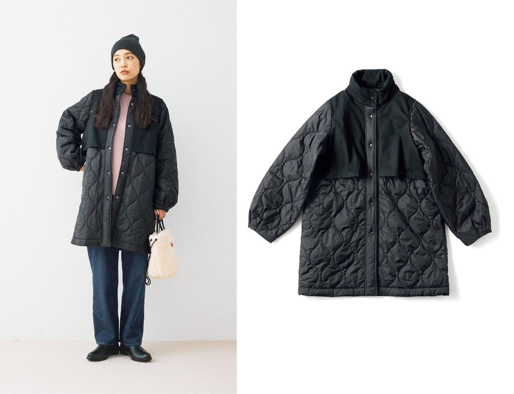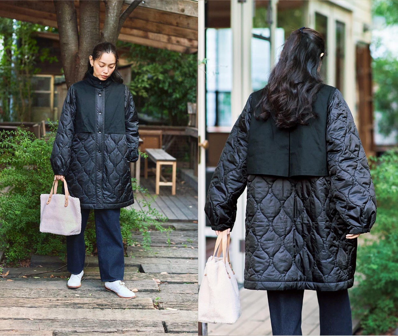 軽くて暖かい、中わたキルティング加工のコートです。袖口のタックやツイル生地のオーバーヨークなど、細部にこだわり、扱いやすさとデザイン性を両立しています。オーバーヨークは前後に配されています。