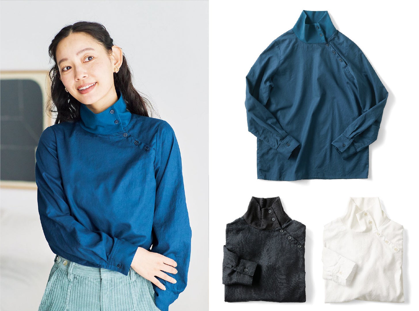 タートルネック部分がカットソー、ほかは布はく生地を使ったトップスです。ネックから左肩にボタン開きがあり、アクセントの効いたデザインが特徴です。すっきりとしたシルエットでインナーとしても使いやすく、袖はシャツ風のカフス仕様で上品な印象です。
