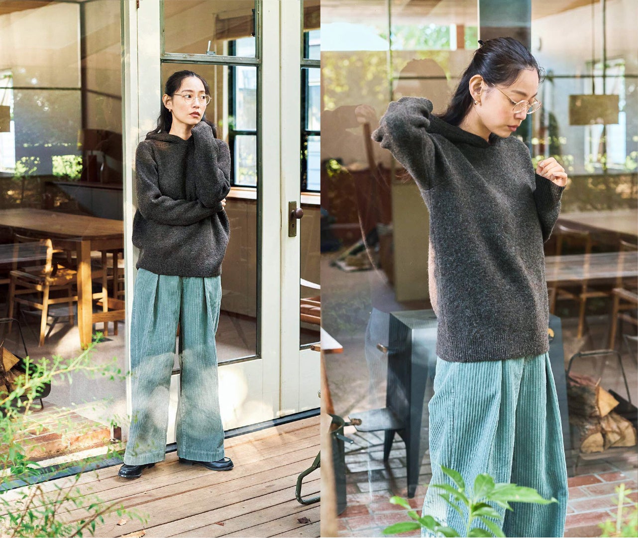 太い畝と細い畝が交互に並ぶ親子コーデュロイを使用したワイドシルエットが特徴のパンツと、毛布のようなパーカーです。パーカーは縮絨起毛加工によりフェルト状の風合いに仕上げられ、やわらかで包み込まれるような着心地です。
