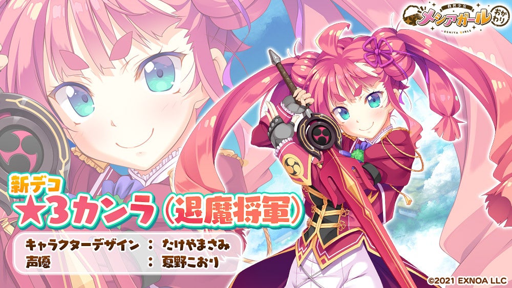 「救世少女 メシアガール おかわり」からの新デコとして「カウントダウンガチャ」には「★3カンラ(退魔将軍)」が追加されています。ぜひ、この機会に獲得ください。