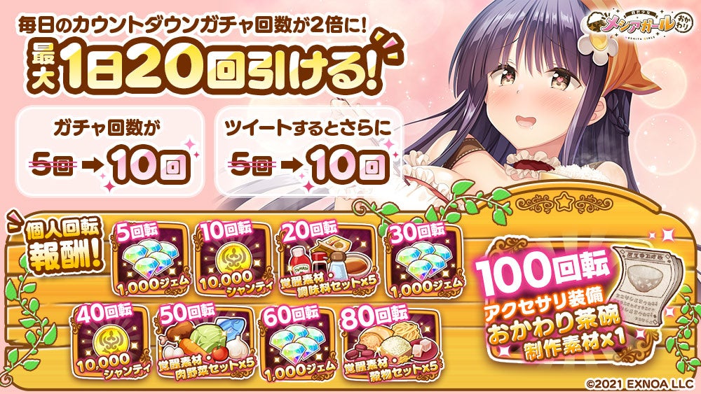 通常5回まで引けるガチャが、10回に回数アップ。ツイートを行うことで引ける回数も、5回から10回にアップします。「毎日最大20回」のガチャを引けるチャンスをお見逃しなく。