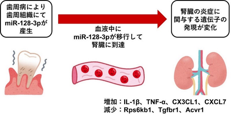 今回、動物実験において、歯周病を発症したラットに高発現したmicroRNAが、血流を介して腎臓に到達し、腎臓において炎症に関与する遺伝子の発現を調節することを解明しました。