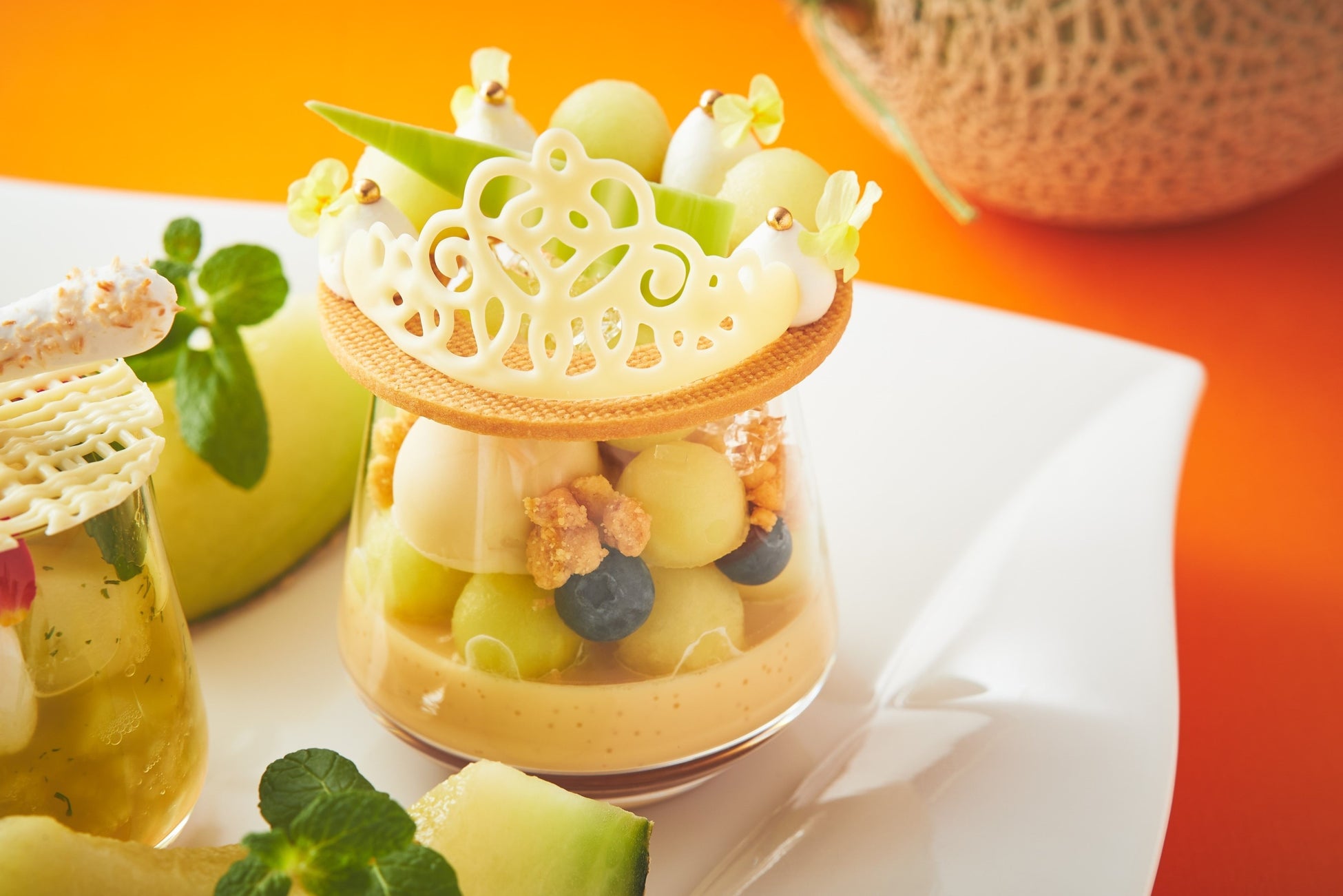 甘さを活かした一つ目(写真右)は、北海道ミルクと和三盆のカスタードプリンの上に、メロンやブルーベリー、バニラアイスなどを重ねた一品。トッピングにはカモミールのジュレや生クリームとともに、「果物の女王」とも呼ばれるメロンにぴったりなホワイトチョコのティアラを飾りました。