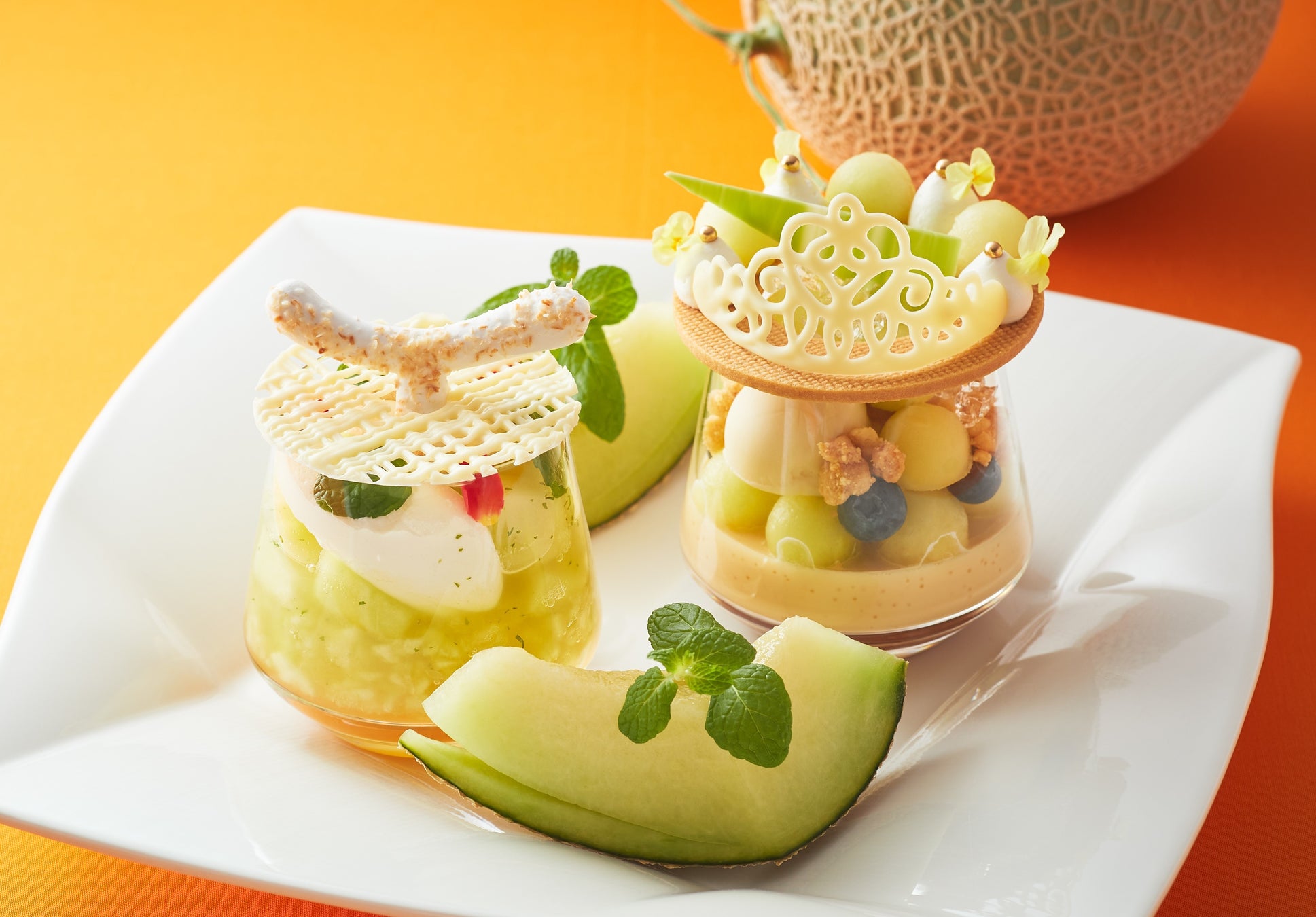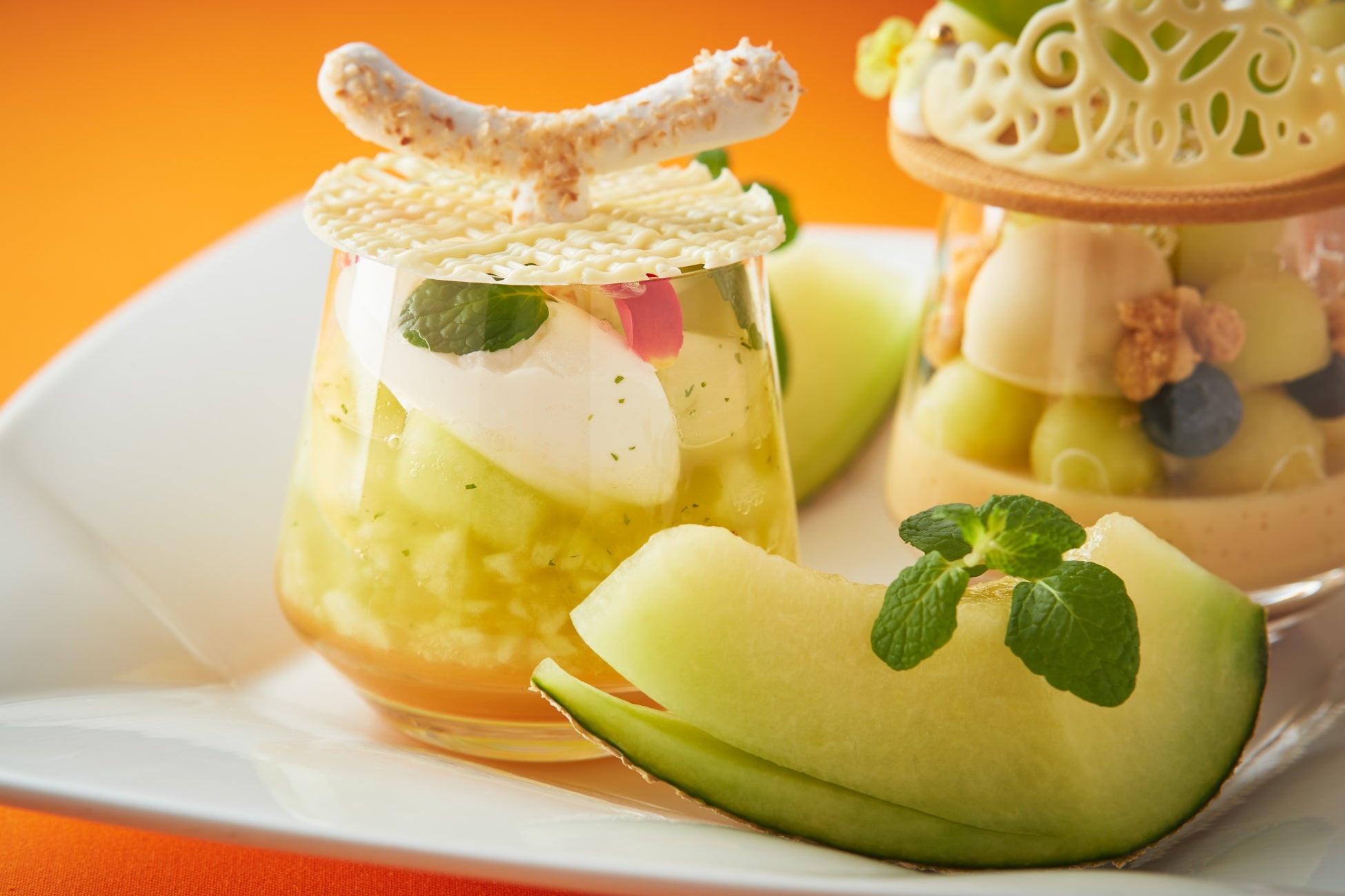 カットしたメロンを添えた2種のパフェで、メロンの甘さと爽やかさを味わう初夏の贅沢なひとときをお楽しみください。