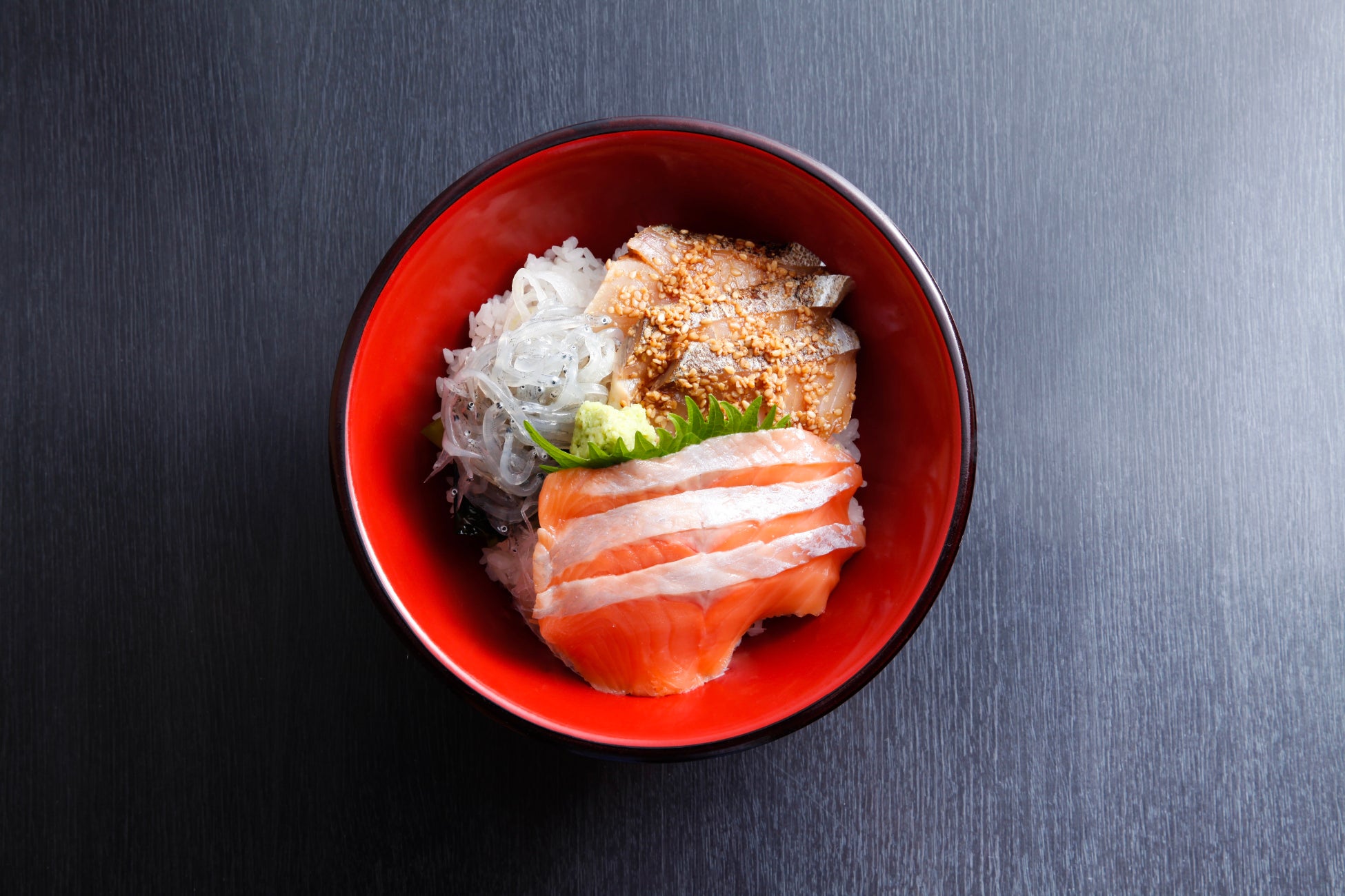 淡路島三食膳の丼物内容:淡路島の生しらす 淡路島サクラマス 淡路島のサワラ胡麻醤油 ぽん酢マヨネーズソース 山葵醤油 二分出汁 淡路産玉ねぎ 淡路産若芽 海苔 大葉 刻み茗荷 サクラマス皮味噌柚庵揚げ