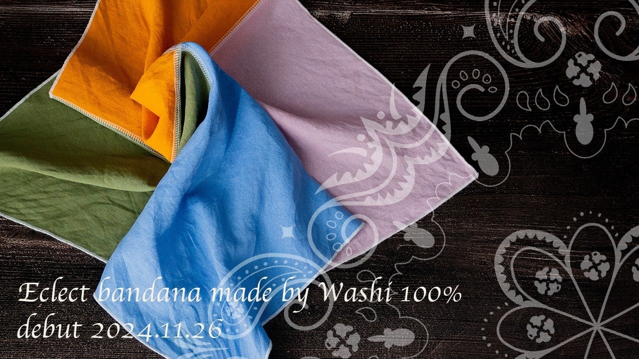 ファーストアイテムは、「ECLECT」のメンバー4人のキーカラーを縫い合わせたバンダナ「結(ゆい)」。ファクトリーブランド「WASHI-TECH」とのコラボにより、地球環境への負荷が少ないサステナブル素材「和紙」を100%使用したWASHI-TECH製のバンダナが誕生しました。また、同じ和紙素材を使用したTシャツ「箔(はく) 」と長袖シャツ「粋(すい) 」も販売予定です。