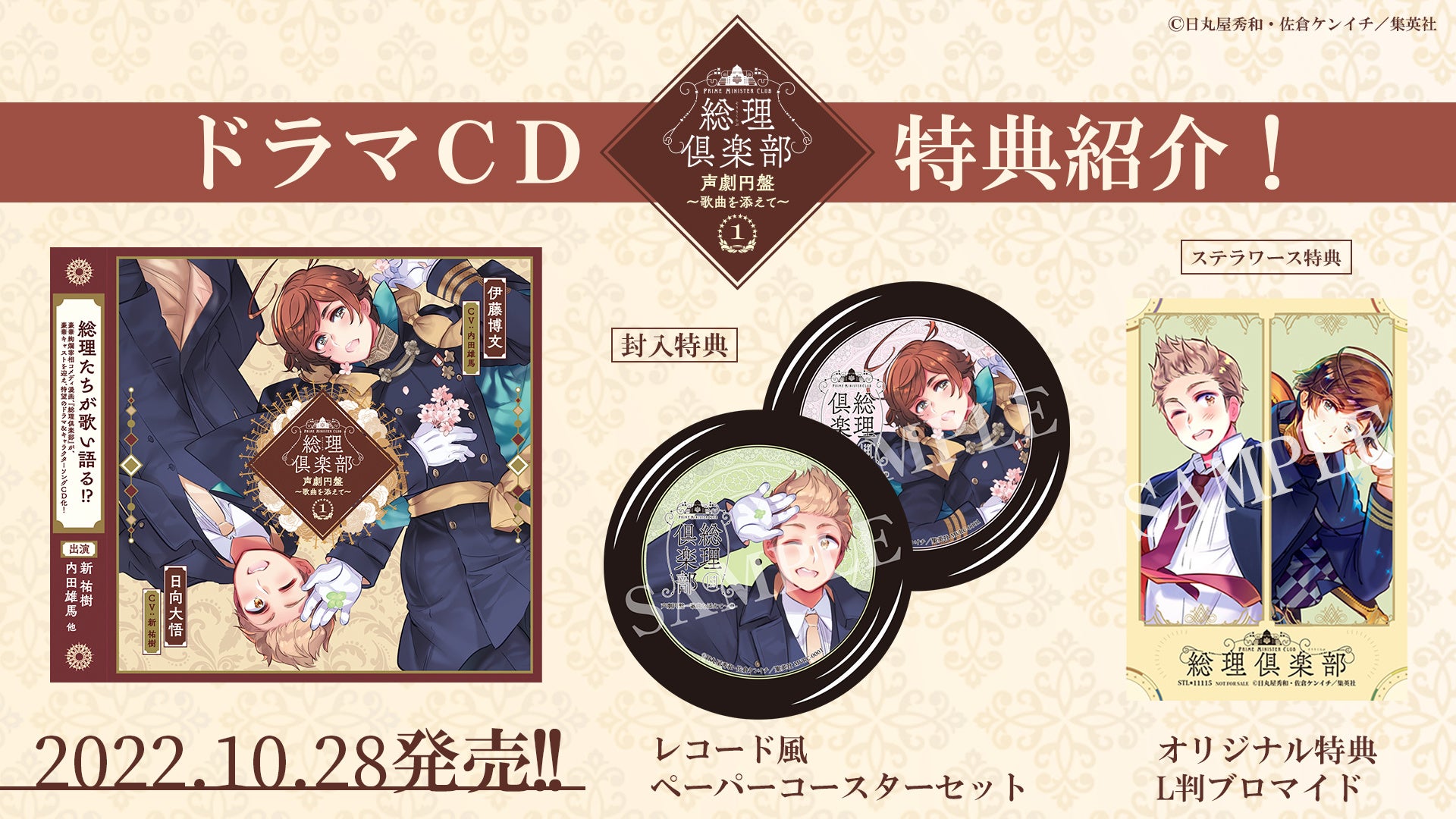 今回は、10月28日(金)に発売される『総理倶楽部 声劇円盤~歌曲を添えて~①』のジャケット画像と封入特典のレコード風ペーパーコースターセット(日向大悟、伊藤博文)、ステラワース特典のL版ブロマイドそれぞれの絵柄を公開!