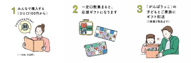 ひと口100円(+10% 110円)から参加できます。3ヵ月に1度、集まった金額に応じ、C.C.P×tupera tuperaさんコラボ商品をがんばりっこに登録しているご家庭にお届けします。