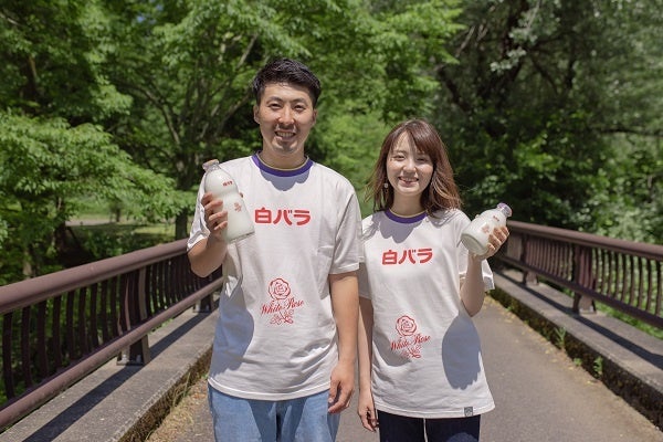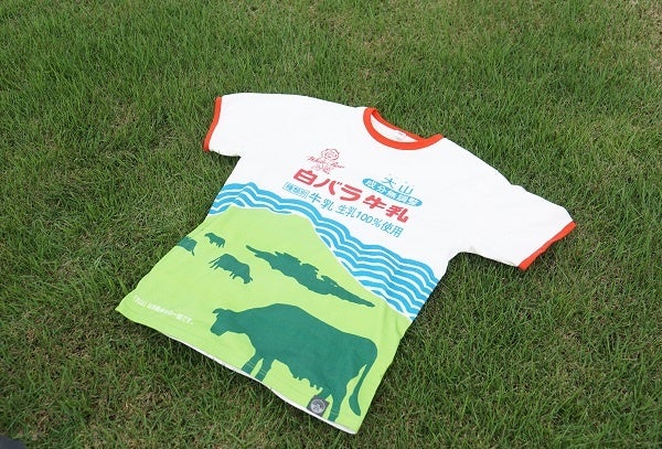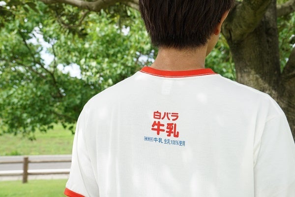 また新たに「【宅配専⽤】特選⽩バラ⽜乳」の瓶デザインをイメージしたTシャツも登場!