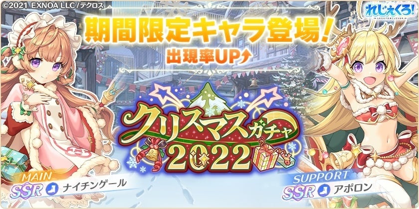 合同会社EXNOA(本社:東京都港区、CEO:村中 悠介、URL:https://games.dmm.com/)が運営するDMM GAMESにおいて、真の英雄となる王道ファンタジー『れじぇくろ!~レジェンド・クローバー~』(https://www.legend-clover.net/)は、期間限定キャラとして、キュートなクリスマス衣装に身を包んだ「ナイチンゲール」と「アポロン」が新登場したことを発表した。さらにイベント限定のクリスマス「ニャルラトホテプ」が手に入るクリスマスイベントも開催している。