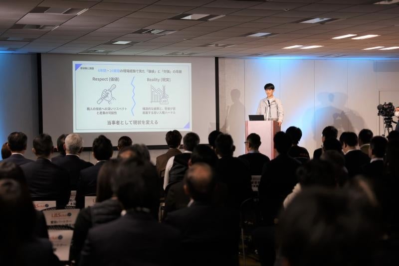 次世代ピッチでは、岡山大学発ベンチャーで建築DXを推進する「ビルベイス」代表の佐々木健人さんが登壇し、建設業界の課題解決を目指したビジネスモデルを披露しました。技術や仕組みの構築に加え、施工会社として現場に直接関わる「現場発のイノベーション」のビジネスモデルが来場者の注目を大いに集めました。