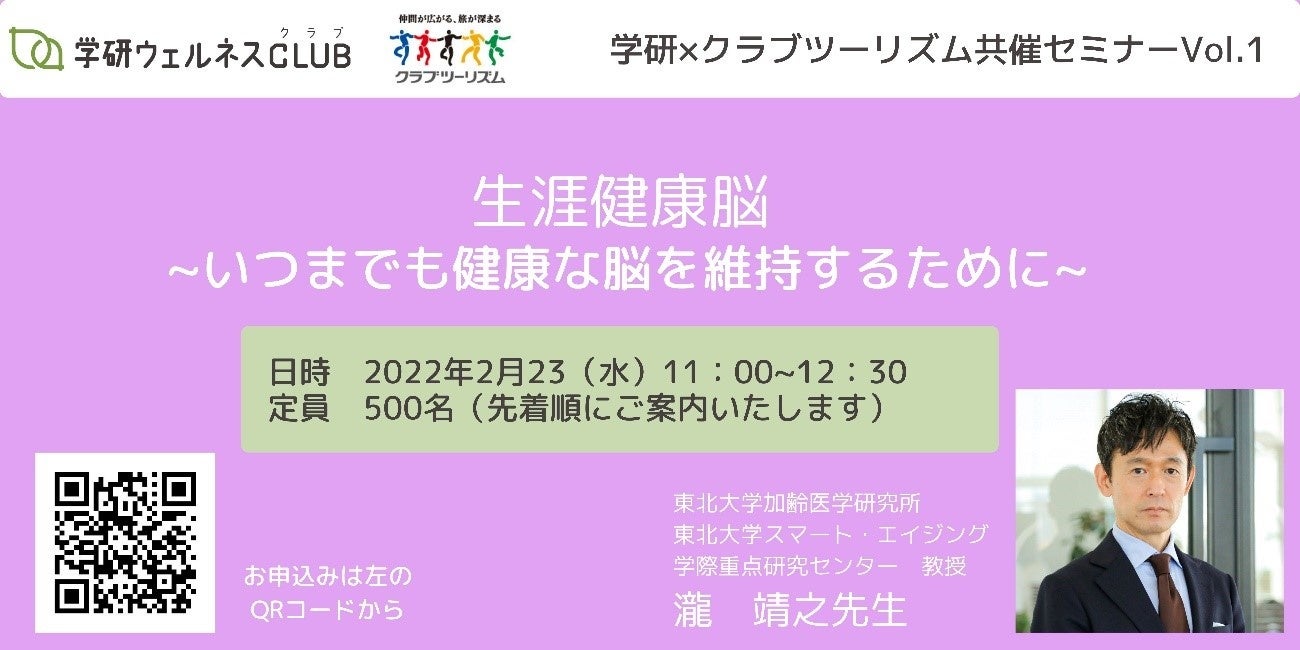 株式会社 学研ホールディングス(東京・品川/代表取締役社長:宮原博昭)の認知症予防研究室と、クラブツーリズム株式会社(東京・新宿/代表取締役社長:酒井博)は共催で2022年2月23日(水)に東北大学加齢医学研究所、東北大学スマート・エイジング学際重点研究センター教授 瀧靖之先生による、認知症予防に役立つウェブセミナーを開催いたします。