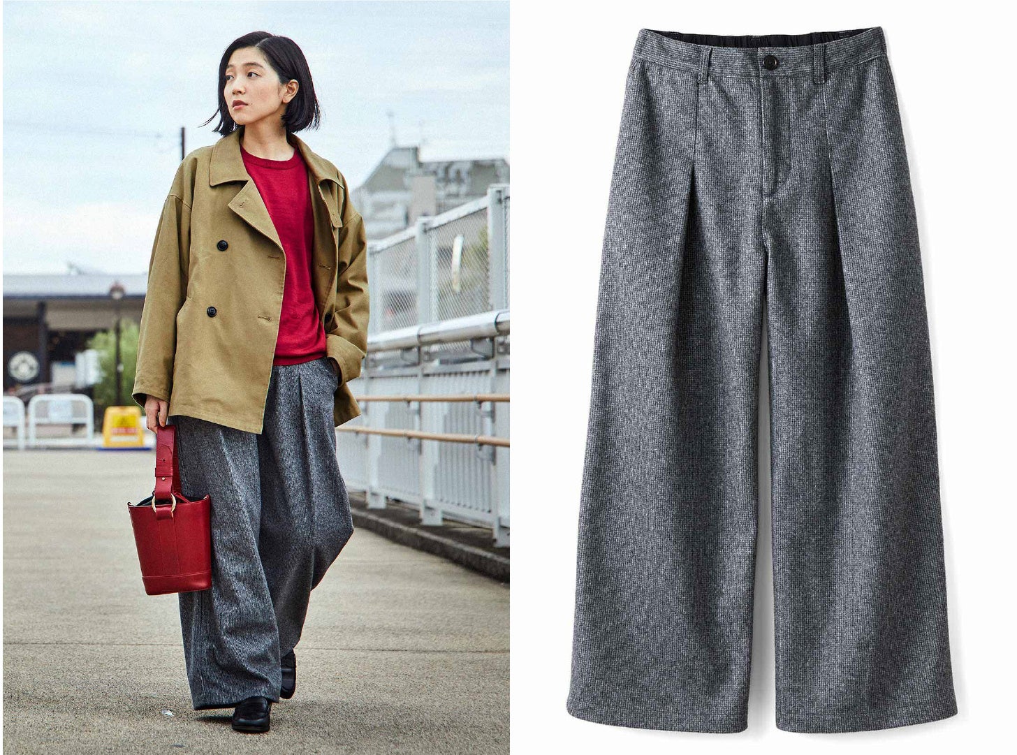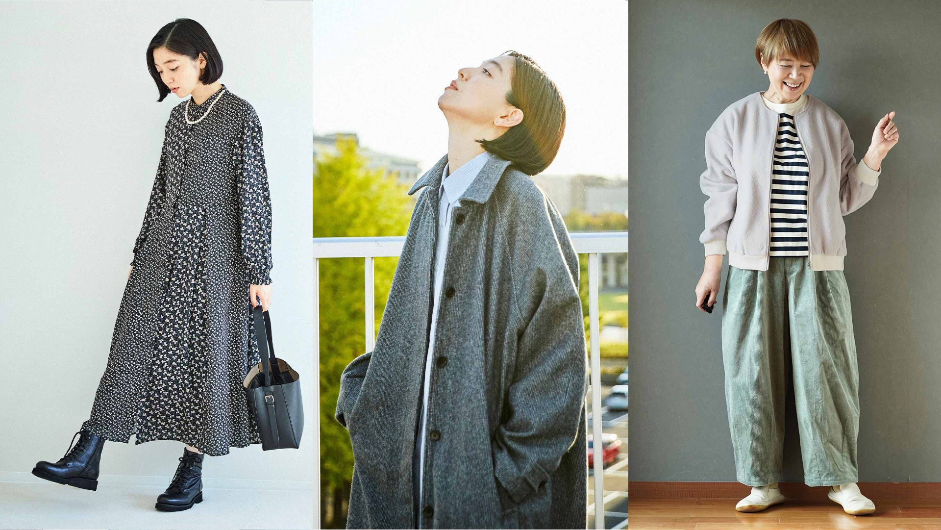 トラディショナルなステンカラーコート、ヴィンテージ風のワイドパンツ、そしてアレンジ自在のストライプシャツの3アイテムは、それぞれ上品なディテールと洗練されたデザインが特徴です。
