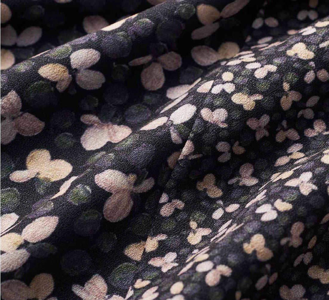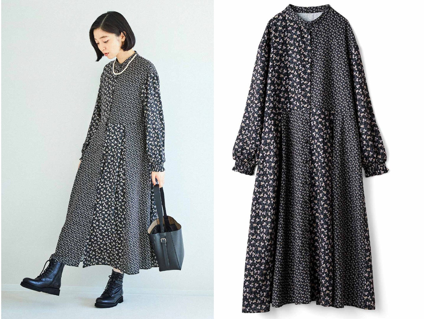 ボタニカル柄が魅力の前開きワンピースです。同柄を大小の異なる比率で切り替えた、シンプルながら奥行きのあるデザインです。ウエスト下のタックと袖口のギャザーが、自然なドレープを生む立体的なシルエットです。