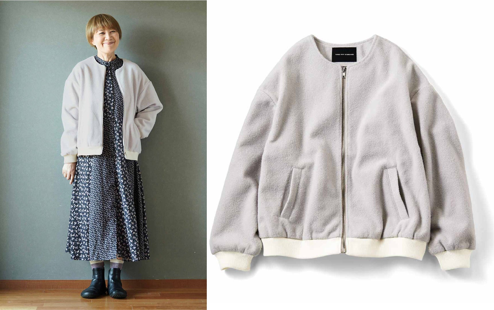【NEW】THREE FIFTY STANDARD 金子敦子さんと作った コート生地で仕立てたノーカラーブルゾン〈ライトグレー〉