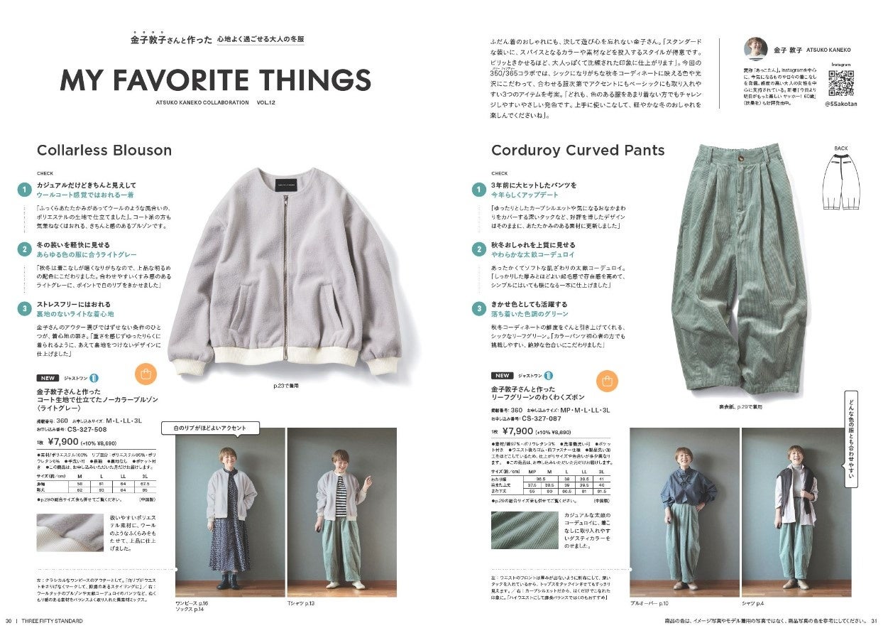 フェリシモが展開するファッションブランド、「THREE FIFTY STANDARD[スリーフィフティースタンダード]」が新作を発表するデジタルカタログを発刊、11月28日に2024-2025 WINTER COLLECTIONサイトを公開して、ウェブ販売を行っています。冬の新コレクションのテーマは「Color Your Life!」です。ミュルーズモダン・ボタニカル柄の「ヴィンテージパターンワンピース」や、モデルの小谷実由さんと作ったセットアップとしても着こなせる「細かいチェック柄のアンクルコート」と「ワイドパンツ」、ファッションインスタグラマーの金子敦子さんと作った「コート生地で仕立てたノーカラーブルゾン」やミニショルダーにも大容量トートにも使える「便利な2-WAYバッグ」などです。アイテムの詳細は、デジタルカタログや特集ページでチェックできます。定期便と一緒に「金子敦子さんと作った便利な2-WAYバッグ」を買うと特別価格になる「いっしょ買いキャンペーン」も行っています。