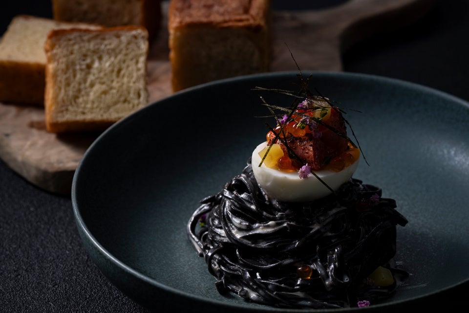 ランチ&ディナー:2,900円 貝の旨味を加えた白ワインをベースに作り上げたクリームソースに、辛子明太子のコクと辛味を加え、まろやかな甘みや苦みが特徴的なイカ墨を練りこんだタリオリーニを絡めました。トッピングには濃厚な能勢おうはん玉子と焼き辛子明太子に加え、イクラの塩味と『夢シルク』の甘味も加えた期間限定のパスタ。