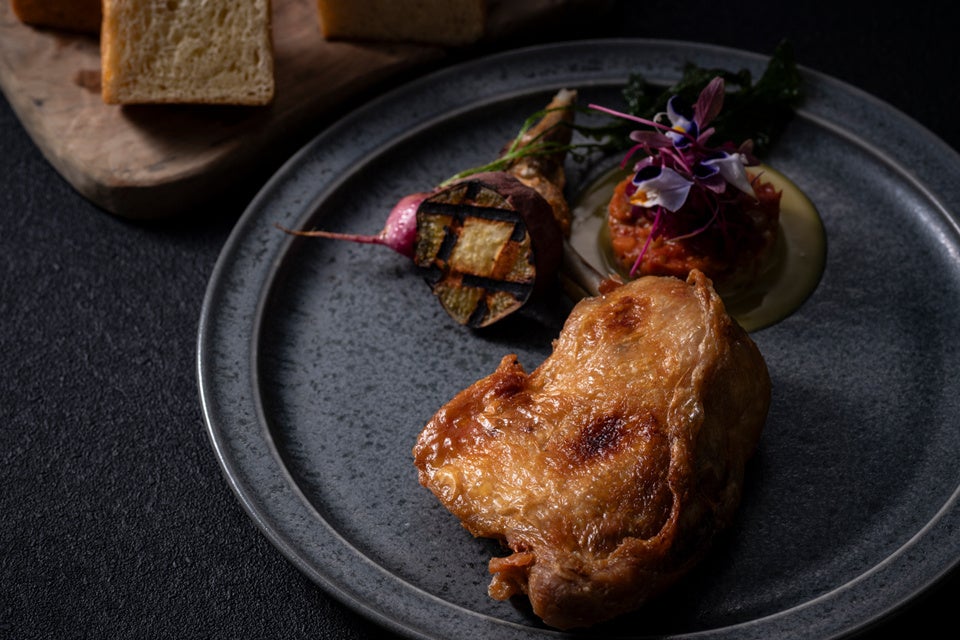 フランスの郷土料理カスレをオマージュし、ピクニカスタイルへアレンジした一品。河内鴨の脂をベースに、『夢シルク』とレンズ豆を煮込みと共に、ママレードソースを添えました。香ばしい鶏もも肉の風味と食感、ジューシーな味わいをお楽しみください。