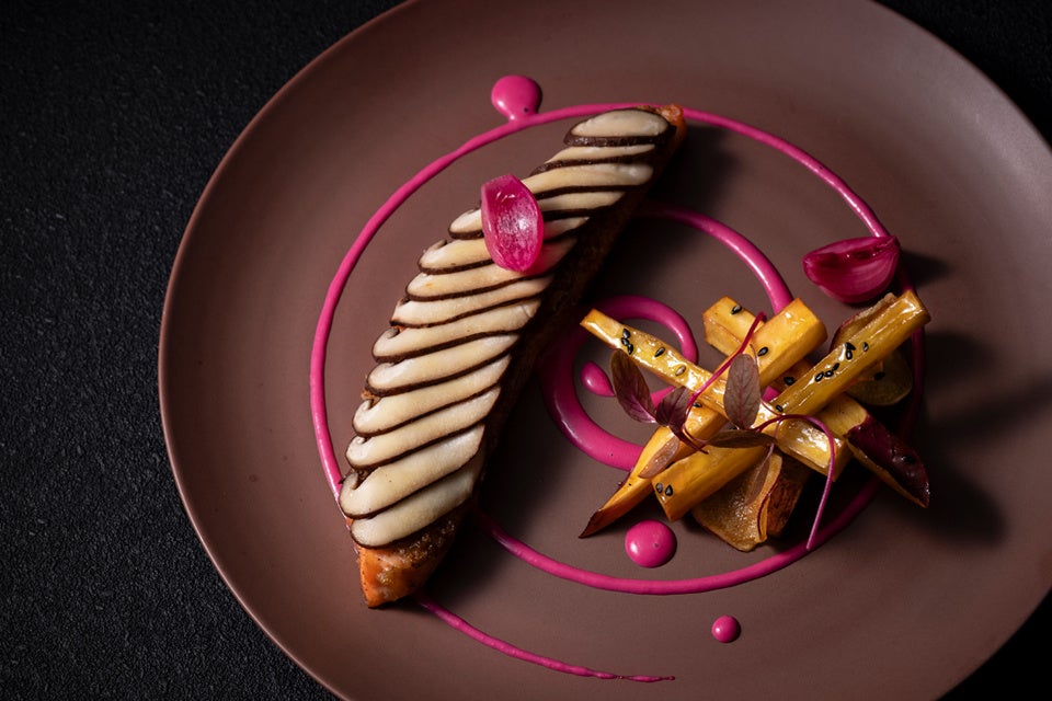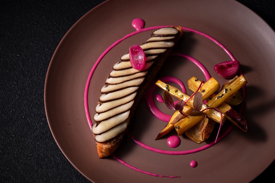 香ばしい茸バターとサーモンのハーモニーに、『夢シルク』の大学ポテト風を添えました。秋色が美しいリンゴとビーツのソースでお楽しみください。