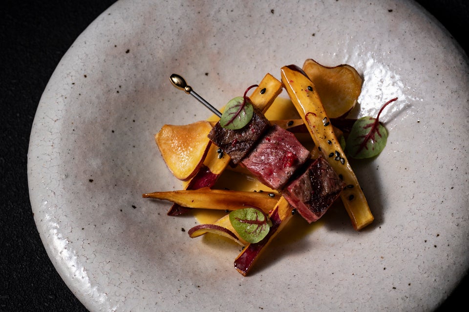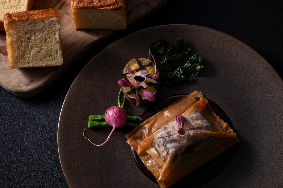 身が厚くしっとりとした食感が楽しめる大阪産(もん)食材「美陵鰻(みささぎうなぎ)」の魅力を最大限に引き立てる為、濃厚かつ上品な甘みと、とろける舌触りが特徴の大阪府産サツマイモ『夢シルク』と、蜂カレー粉でスパイシーに仕上げた茄子をトッピングしました。 それぞれの香りと温度を保つ為パートフィロで包み焼きし美陵鰻(みささぎうなぎ)の骨で作る赤ワインソースで仕上げたこだわりの一品。