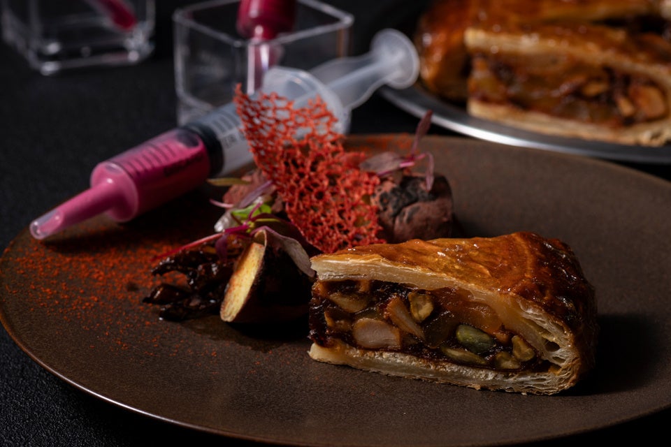 なにわ黒牛の赤ワイン煮込みと国産鶏もも肉のコンフィをリンゴと共に混ぜ合わせ、数種のスパイスやハーブで仕上げたディアブル(悪魔)仕立てを生ハムと共にパイで包み、香ばしく焼き上げました。注射器のビーツソースをかけながらお召し上がり下さい。「Happy Halloween!!」
