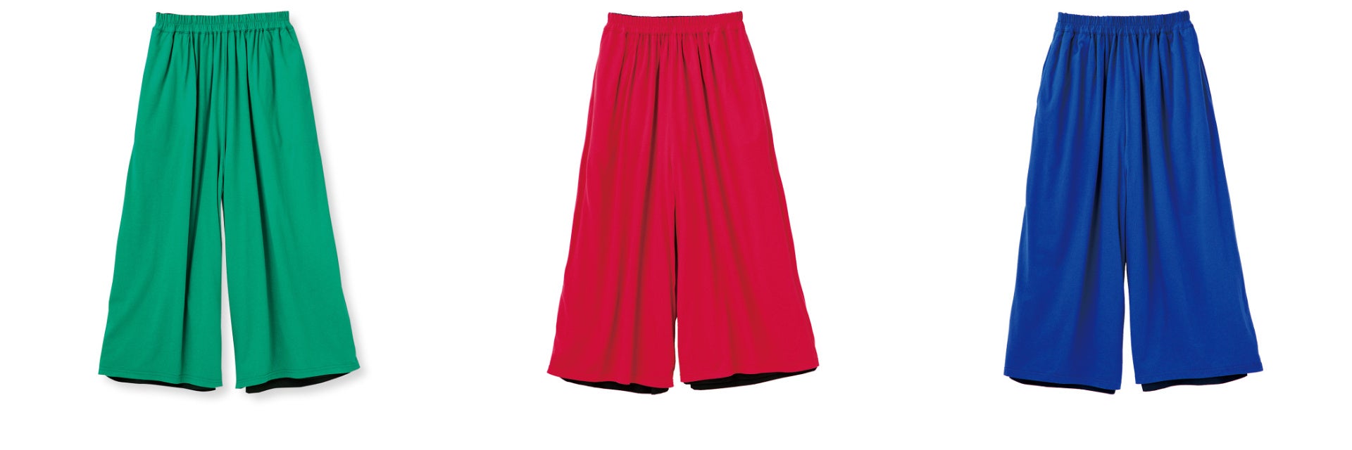 ベーシックカラーとアクセントカラーの2色をリバーシブルデザインで楽しめるパンツです。スカートのようなボリューム感と上品な落ち感で、さりげなく体形をカバーしながらすっきりきれいなシルエットで着こなせます。シンプルなトップスを合わせるだけで、好バランスなパンツスタイルが完成するのもうれしいポイントです。素材は、アクセントカラー側は肌ざわりのよいカットソー、ベーシックカラー側はさらりと落ち感のあるきれいめ素材で雨の日も安心な撥水加工がほどこされています。ウエストは総ゴム仕様なのでらくちんです。デザインは〈カーキ×グリーン〉〈ブラック×レッド〉〈ネイビー×ブルー〉の3種類。きれい色にトライしてみたいと思っている方にも、ベーシックカラーとのリバーシブルはおすすめです。