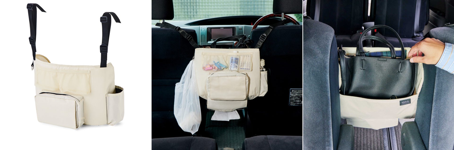 ヘッドレストに掛けるだけで、運転席と助手席の間に便利な収納スペースを作ってくれる収納ボックスです。すぐに取り出したいウェットティッシュやボックスティッシュなどが定位置に装着できます。サイドにはボトルポケットやゴミ袋がかけられるフックなども付いていて、ドライブ中の子どものお世話に大活躍です。デザインは〈アイボリー〉〈ブラウン〉〈ブラック〉の3種類で、どんな車にも馴染みやすいカラー展開。助手席、運転席側からでも荷物にアクセスしやすい位置にバッグが置けるのもポイントです。