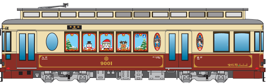 「都電クリスマス号」は、9001号車(赤いレトロ車両)の車内にクリスマスをイメージしたステッカー装飾を施すとともに、車両前面に東京さくらトラム(都電荒川線)のマスコットキャラクター「とあらん」をあしらったヘッドマークを装着し、乗車したお客様や、沿線の方々にクリスマスの雰囲気をお届けいたします。是非「都電クリスマス号」をご利用ください。