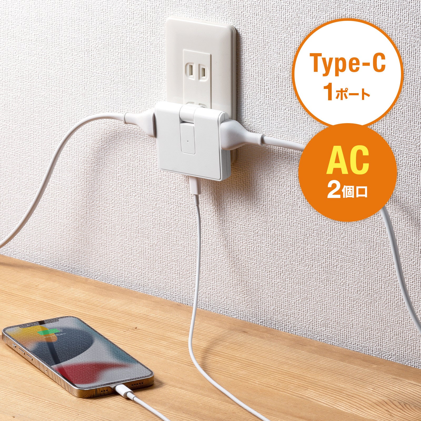「TAP-B104UC」は、Type-Cポートを搭載した、コンパクトな2P・2個口タップです。