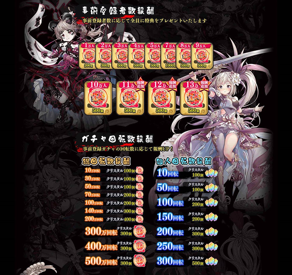 ※事前ガチャ個人回転数報酬は回転数に応じたクリスタルをプレゼントします。