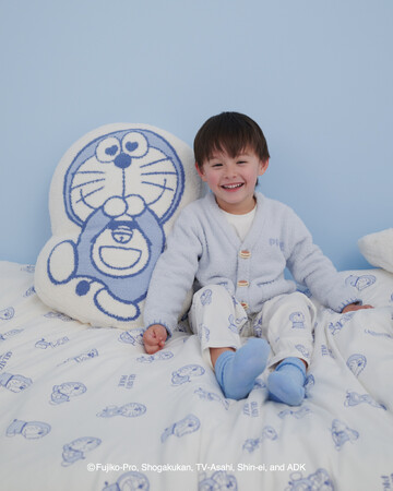 ドラえもんとドラミの様々な表情をジャガードで描いた’ベビモコ’素材のマルチカバー、ピローケース、クッション、寝具3点セット。優しいワントーンの色合いでインテリアに馴染みやすく、ベッドやソファ周りのアクセントに最適です。