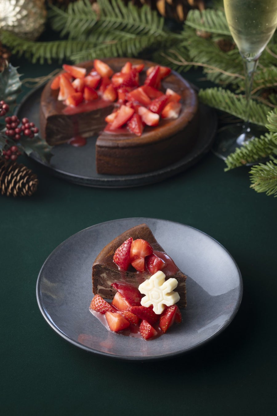 ココアパウダー入りの濃厚なケーキは、チョコマーブルの美しい断面が特徴。ケーキの上には、真っ⾚な国産いちごといちごのソースをたっぷりと。