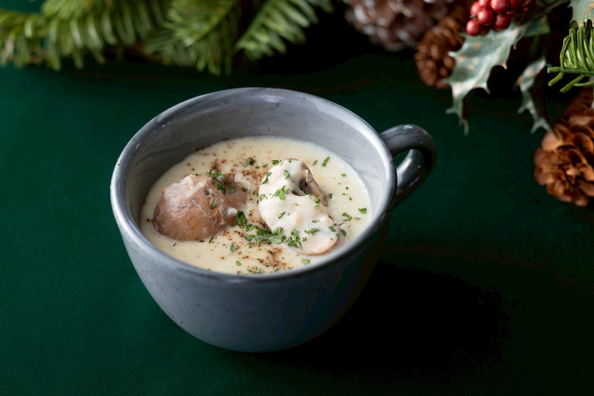 ゴロっとカットして軽くソテーしたマッシュルームとホクホクのじゃがいも、⽟ねぎやセロリなどの野菜が、やさしくおなかを満たしてくれます。