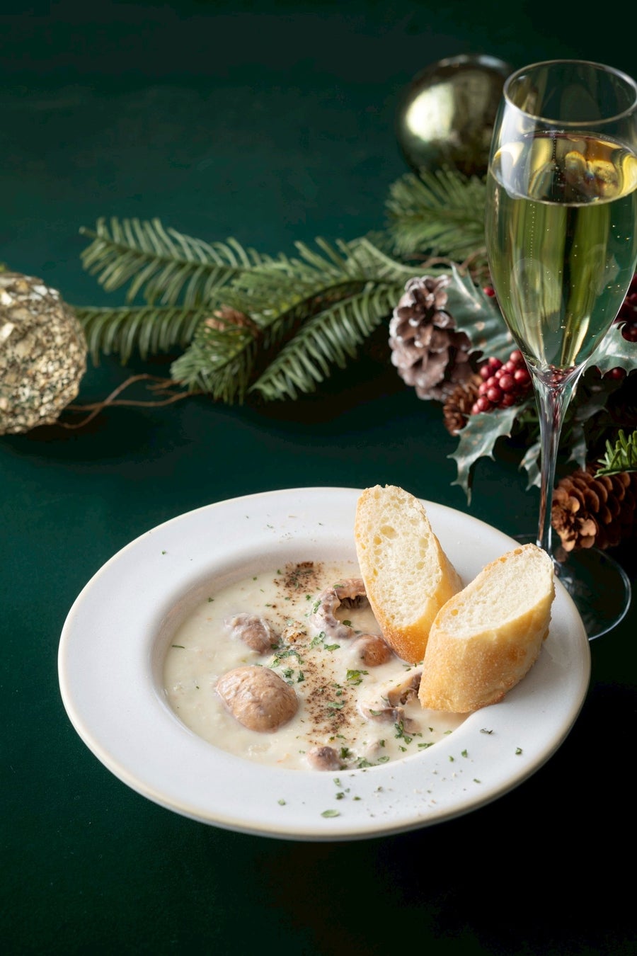 「Joyful Christmas 2025」の期間中は、お⾷事をご注⽂のお客様限定で提供している人気のスープセット(330円)を+220円でクラムチャウダー(※バゲットなし)にグレードアップできます。