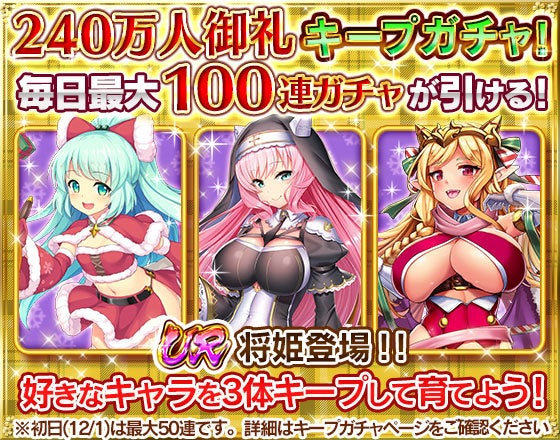 DMM GAMES萌える戦国ゲーム【戦乱プリンセス】240万人御礼キャンペーン開催☆毎日最大100連ガチャが引ける!?好きなURを最終進化させよう♪討伐イベントにサンタコス『妙印尼』が登場!