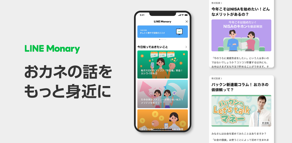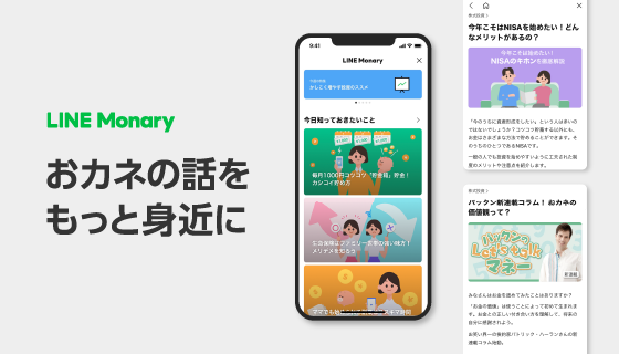 LINE 株式会社(本社:東京都新宿区、代表取締役社⻑:出澤 剛、以下LINE)は、当社が運営するコミュニケーションアプリ「LINE」 内ウォレットタブ上において、暮らしにまつわるお金の知識を深める様々なコンテンツを展開するメディア「LINE Monary」の提供を開始したことを、お知らせいたします。