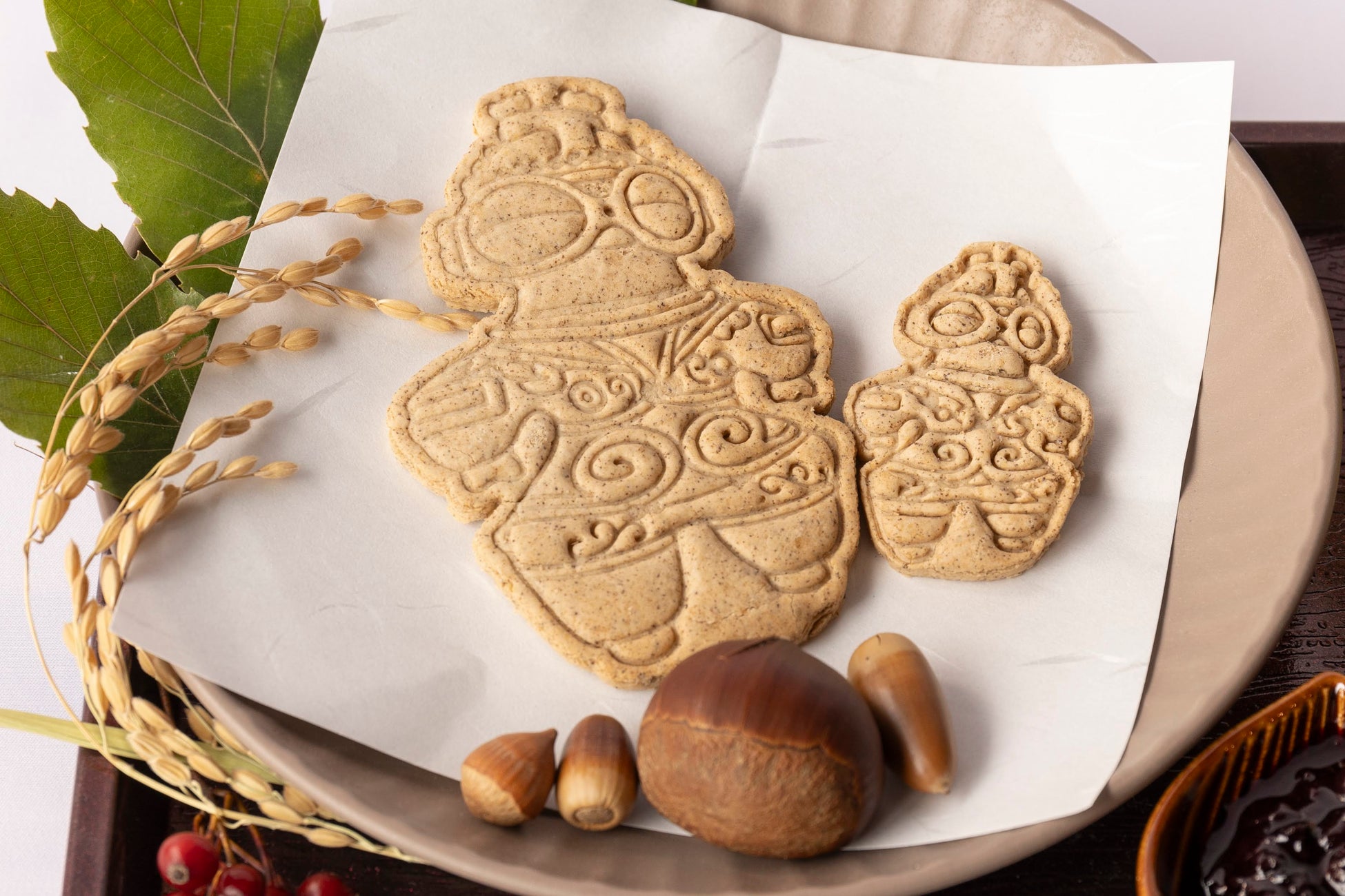 遮光器土偶をモチーフにし、青森県産の米粉、どんぐり粉、津軽海峡の塩を使って焼いたグルテンフリーのクッキーです。