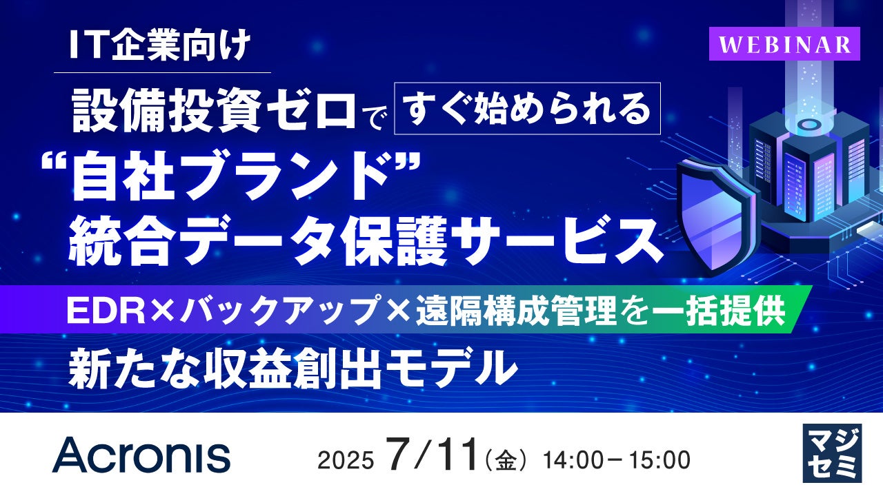 マジセミ株式会社は「【IT企業向け】設備投資ゼロですぐ始められる“自社ブランド”統合データ保護サービス」というテーマのウェビナーを開催します。